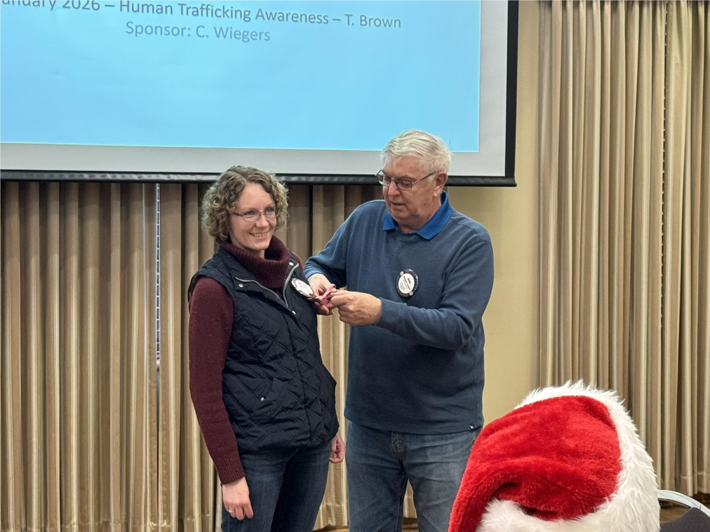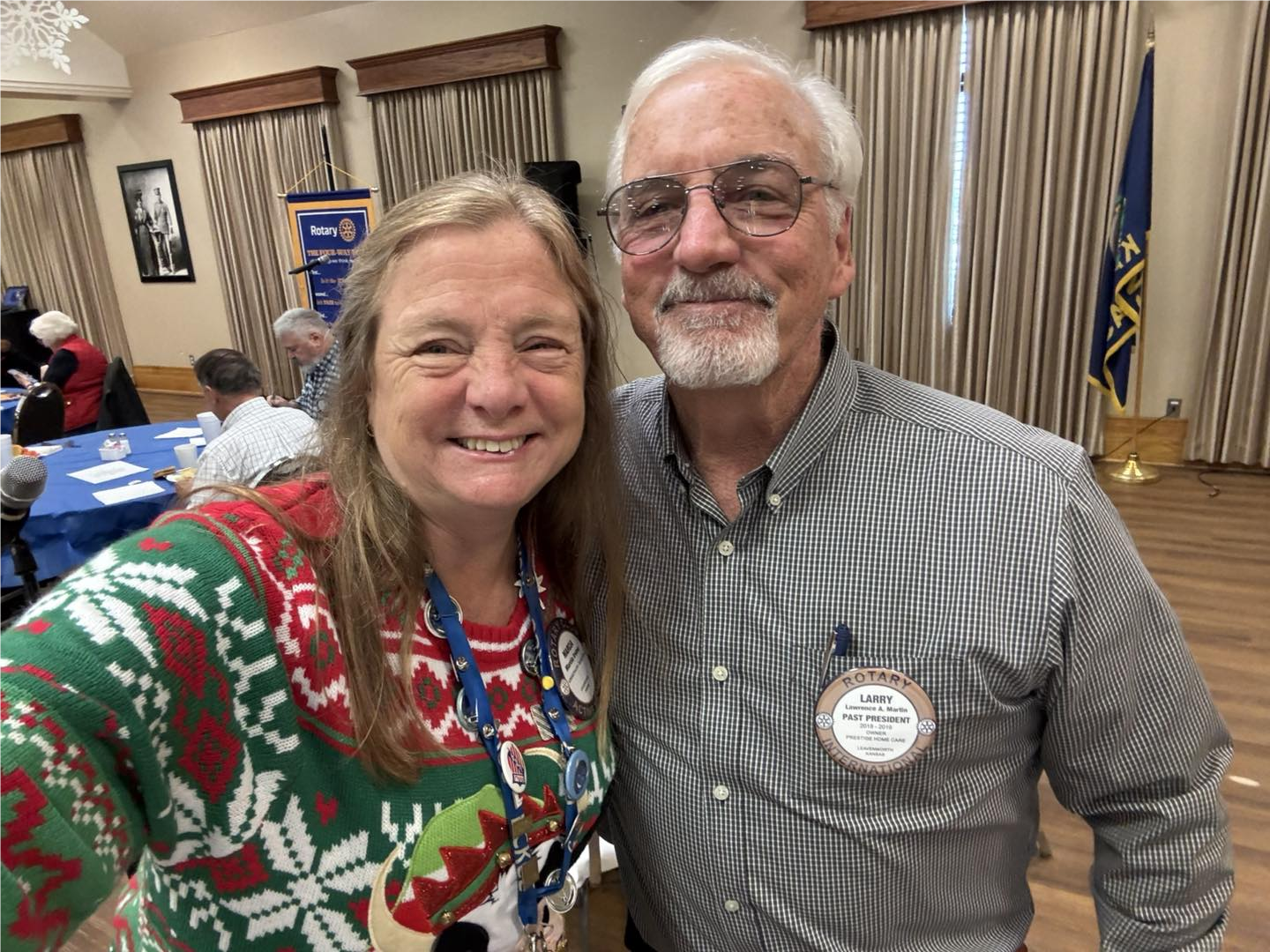 Gary Cordes hosted our senior guest visitor from Basehor-Linwood High School at our last meeting in December. New Rotarian no longer; sponsor Doug Tystad cuts off Kelly Tystad's new member ribbon; Kelly completed several tasks and earned points to lose her new member ribbon - way to work it, Kelly!