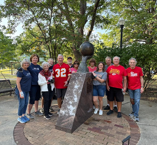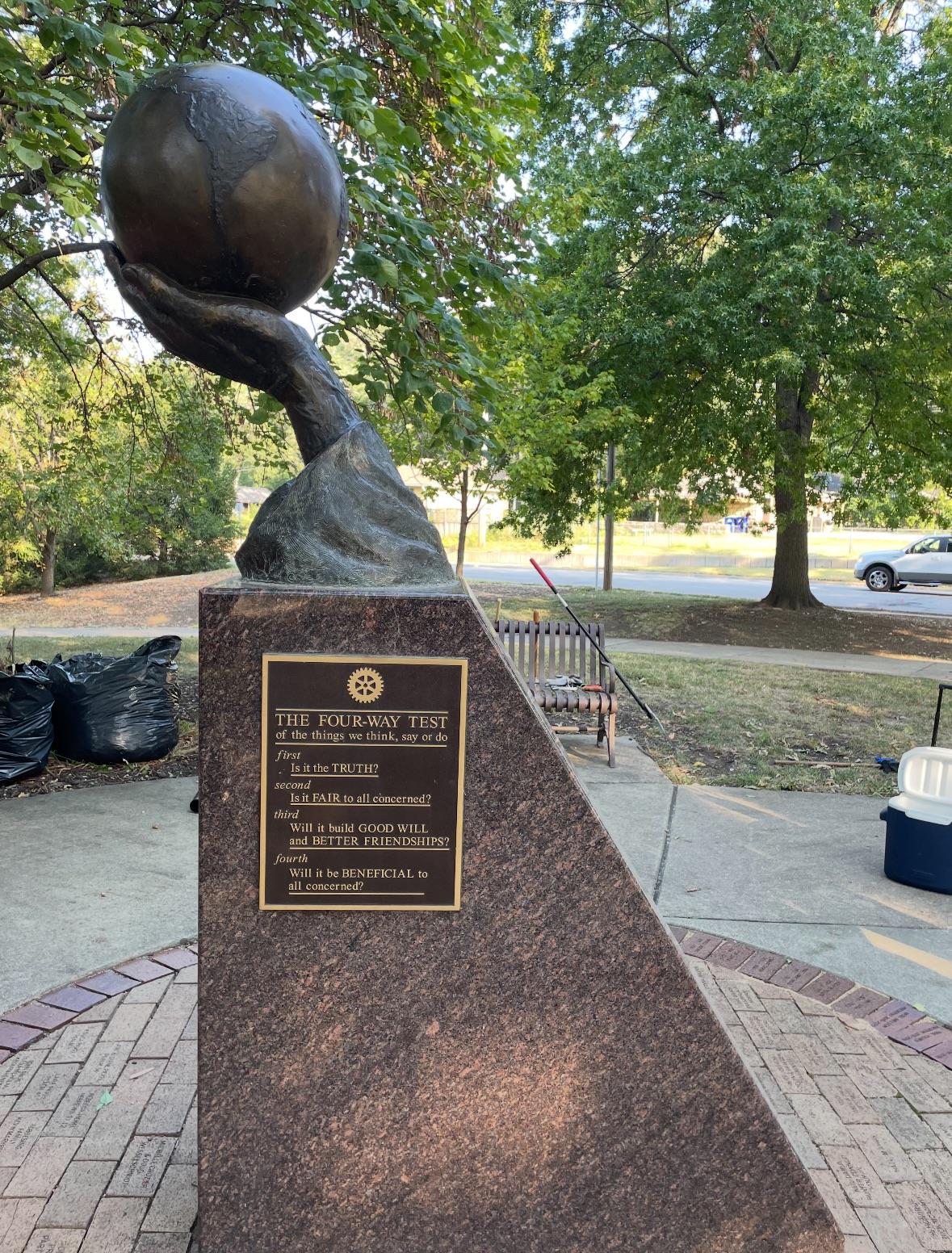 A group of Shawnee Rotarians spent a couple of hours on Friday, September 12, 2025, cleaning up around our "Lend a Hand" sculpture in Listowel Park (71st and Quivira). In 2004, Rotary International encouraged Rotary Clubs to complete a project to celebrate Rotary International's 100th Anniversary, which was February 23, 2005. Our Shawnee Rotarians came up with an idea for the area where the sculpture is located; local artist Charles Goslin (1930-2023) designed and created the sculpture; the City of Shawnee provided the area, and the rest is history. There is more to this story, and in the future, we will have a club meeting in the Park to share the details of how we made this happen. We are very proud to have this labor of love in Listowel Park, one of Shawnee's Sister Cities.