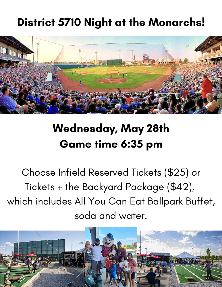 Second, we are still planning our family night at the ballpark with the Monarchs (at the Legends) and hoping you can join us for a fun night. Details are outlined later in the newsletter and/or you may register by clicking here. Let’s plan on meeting for an evening of fellowship with our brothers and sisters in Rotary and of course, friends are always welcome.
